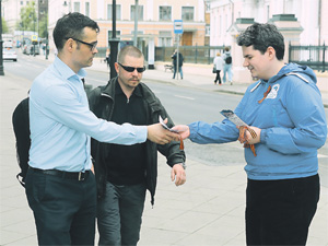 Тимур Шахер (справа) раздаёт георгиевские ленточки на улицах Москвы.