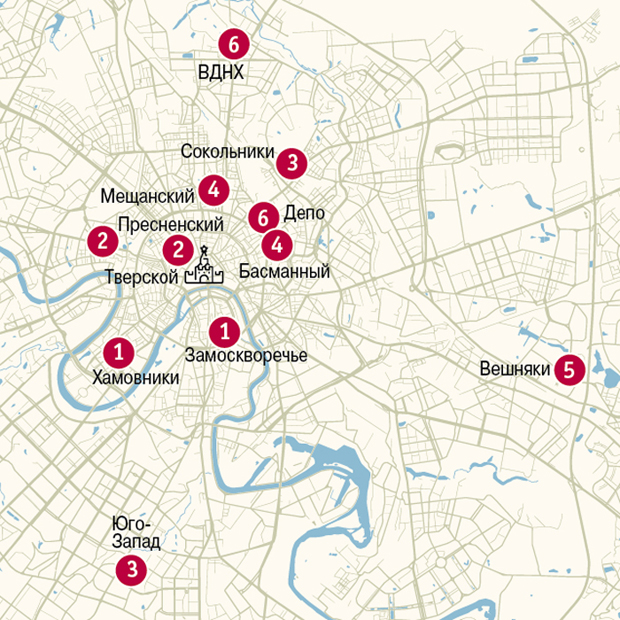 В Пресненском районе сосредоточены рестораны северной кухни, где подают строганину из муксуна и нельмы, оленину и морошку. В районе Тверского бульвара и прилегающих переулков работают заведения, специализирующиеся на дичи и сибирских деликатесах.