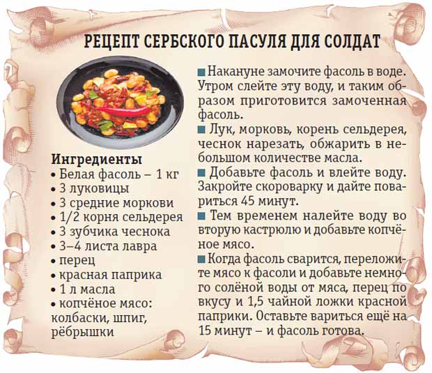 Или сербский пасуль. Нежный, густой суп из фасоли, болгарского перца, сала и копчёных колбасок. Между прочим, именно пасуль готовили сербские партизаны во время Второй мировой войны».