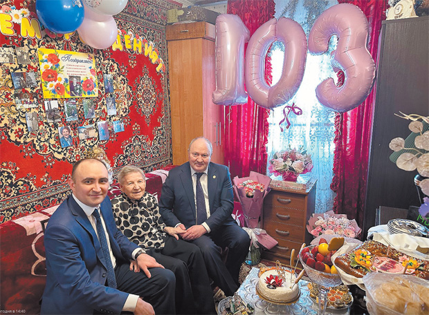 16 апреля заместитель премьер-министра Республики Татарстан — полномочный представитель региона в России Равиль Ахметшин (на дальнем плане) — и заместитель полномочного представителя по взаимодействию с органами госвласти в сфере культуры, науки, образования и связей с общественностью Эмиль Файзуллин поздравили свою землячку Анну Серафимовну Панкратову со 103-летием. Пожелали женщине доброго здоровья и поблагодарили за пример, который она подаёт молодёжи своим оптимизмом и жизнелюбием. Фото: Пресс-служба Полпредства РТ в РФ