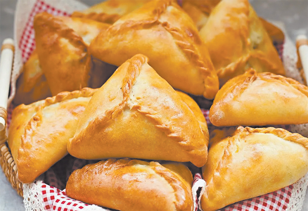 6. Достать противень, в отверстие каждого эчпочмака влить по 1–2 ч. л. горячего бульона. Вернуть в духовку ещё на 15–20 минут до золотистого цвета и готовности начинки.