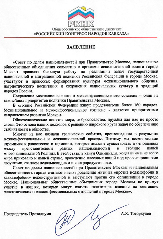 Алий Тоторкулов: Решение о проведении акций, в том числе и митингов, в нашей организации принимается только президиумом, и никто не имеет права единолично планировать такие мероприятия и заявлять об этом. РКНК - общероссийское общественное движение, представляющее все народы Кавказа. Членами президиума являются более двадцати человек от каждого народа, включая казаков, русских и горских евреев. Деятельность охватывает много направлений, мы проводим культурно-массовые мероприятия, благотворительные акции, общероссийские молодёжные форумы, «круглые столы», конференции, пикеты и митинги и т. д.