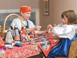 В ожидании конкурса зрители знакомятся с выставкой «Мир детства в русской традиционной культуре», которую организовали в холле. Здесь можно посмотреть экспонаты, пообщаться с руководителем и учениками студии «Русские начала» и самому смастерить куклу. «Мы занимаемся русским народным костюмом. Здесь есть и копии, выполненные с музейных образцов, и раритетные экспонаты», – рассказывает ученица студии Ольга Ростовцева.