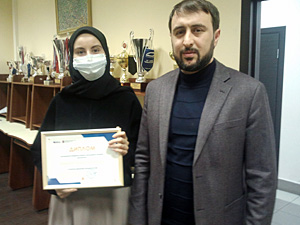 Кялий Хордаева от лица участников команды проекта «Дети мигрантов» получила диплом из рук председателя Всероссийского межнационального союза молодёжи Кантемира Хуртаева