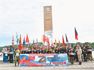 Участники автопробега «Красноярск — Грозный» проехали десятки городов России и в каждом развернули масштабную 20-метровую копию Знамени Победы и 300-метровую Георгиевскую ленту.