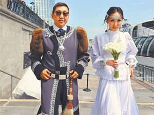 Часто молодожёны на национальных свадьбах выбирают традиционные костюмы. На фото — пара из Якутии.
