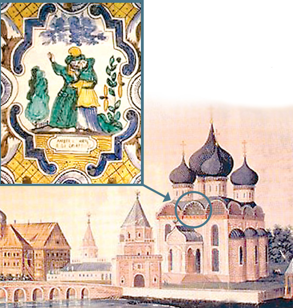 Покровский собор, украшенный «поливными» изразцами. Фото: Гравюра второй половины XVII века