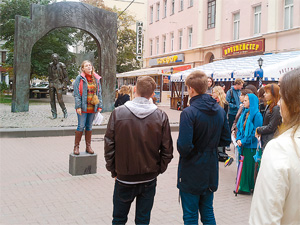 А недавно прямо напротив памятника молодёжь читала стихи. Звучали произведения Пушкина, Лермонтова, Маяковского и, конечно, Булата Окуджавы. Симпатичная девушка, взобравшись на небольшой мраморный постамент, вдохновенно читала его «Виноградную косточку»...