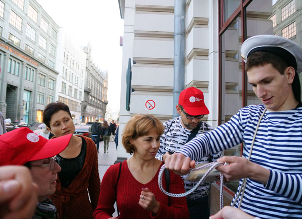 Бредём обескураженные. Какое поле? Какое метро? Кто-то предлагает ехать на «Октябрьское Поле», кто-то на «Полянку». Правильная версия рождается далеко не сразу. «Поле? Метро? Может быть, это гостиница «Метрополь»?» - говорит кто-то, и мы бежим туда. Под «Метрополем» нас действительно ожидает наряженная крестьянкой барышня с корзиной грибов. В ней за минуту надлежит найти три несъедобных экземпляра, чтобы получить следующую подсказку. Я лично выуживаю два гигантских мухомора и нервничаю: что делать с измазанными ядом руками? «Ой, да ради бога, ничего с вами не будет, - улыбается Фрида, участница. - У меня соседка по даче всю жизнь эти мухоморы и сама ест, и нас угощает. И ничего. Румянец только!» Крестьянка отправляет нас к милиционеру со светофором, и неслучайно - ведь в 1930 г. на оживлённом перекрёстке двух главных торговых улиц города - Петровки и Кузнецкого Моста - был установлен первый в Москве светофор. Ещё мы вяжем морские узлы с моряком и гоняемся за монахом. В итоге устаём, но получаем огромное удовольствие и осознаём, какой же у нас удивительно красивый город, каждая улица которого - средоточие поразительных фактов и историй. «Я доволен невероятно, - говорит уже после награждения участников в саду «Эрмитаж» единственный мужчина из моей команды, фотограф Юрий. - Обычно брожу по Москве сам. А тут такая отличная компания и такая потрясающая пробежка». Спасибо, Петровка!
