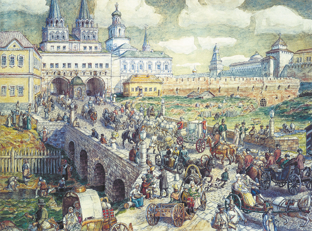 Картина Аполлинария Васнецова «Уличное движение на Воскресенском мосту в XVIII веке». 1926 год. Фото: Wikipedia.org