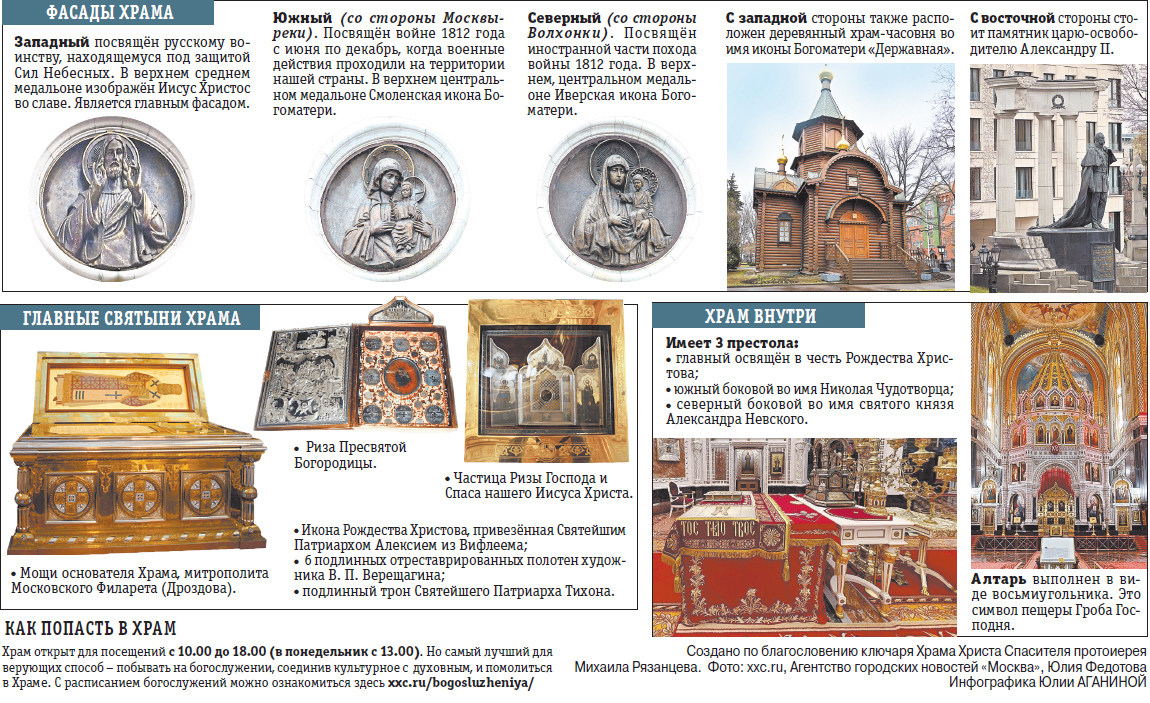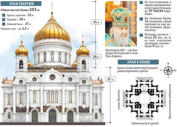 Храм Христа Спасителя – самый большой собор Русской Православной Церкви. Его история началась после войны 1812 года. Он был построен в благодарность за заступничество Всевышнего в критический период истории России и как памятник мужеству. Возведение исторического Храма заняло 44 года. Но в 1931 году он был взорван. Заново Храм был открыт в самые смутные времена для России – 31 декабря 1999 года, в канун 2000-летия Рождества Христова. Воссозданный Храм воспроизведён максимально близко к оригиналу. Во время проектных и строительных работ использовалась информация прошлого века, включая эскизы и чертежи. Именно в этом Храме проходят самые значимые церковно-государственные меропрятия: интронизация патриархов, молебны на национальные праздники и службы в память о выдающихся событиях,здесь проходят отпевания самых значимых россиян.