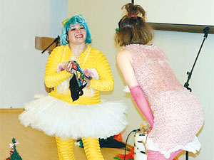 На сцену выскакивают две клоунессы - Тамара Пузанова и Ксения Зубова. Одна кругленькая, как мячик, вторая - высокая и худющая, но обе обладают поразительной способностью мгновенно влюбить в себя всех. Бабушки хохочут, утирая глаза кружевными платочками, подростки снимают пантомимы на мобильные телефоны. А малыши встают на цыпочки, чтобы получше рассмотреть, как одна клоунесса гоняет другую по сцене самым настоящим бичом, с которым обычно выступают дрессировщики тигров. Когда же артистки объявляют, что им нужны добровольцы для «смертельного» номера, несколько смельчаков, которые только и ждали случая проявить себя, пулей бегут к дамам. Новым участникам представления предлагается громко пожелать всему залу здоровья и счастья. Правда, с чупа-чупсом во рту. Когда все конкурсанты справляются с заданием, им выдают по второму леденцу, потом по третьему и четвёртому. «Я жма.. с-с-с.. и о-овья!» - вот и всё, что получается сказать у ребят с четырьмя леденцами во рту. И только один в состоянии произнести фразу целиком, лишь слегка шепелявля, он-то и становится победителем конкурса. Но остальные не расстроены - как вы понимаете, чупа-чупсы у участников никто назад не потребовал. Так они и мусолили их до конца представления.