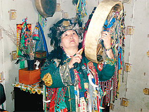 Елена Отсур, председатель другого объединения шаманов «Тос дзэр» («Девять небес»), показывает мне свой арсенал: расшитый халат с привязанными к нему куклами - во время камланий они сообщают окружающим силу тех мест, в которых были изготовлены, головной убор с перьями птиц, кнут, шлифованное бронзовое зеркало, бубен. Зеркало показывает картины из верхнего и нижнего миров, с которым шаман способен общаться, входя в особое состояние. Кнут вырезают только из красного дерева, эту ответственность берёт на себя лишь опытный шаман - непосвящённый человек, срезавший прут красного дерева, может тотчас умереть.