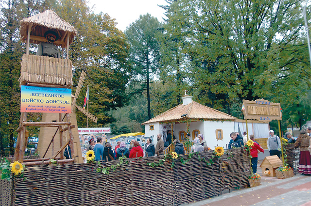 Приобщиться к яркой и самобытной жизни казаков москвичи смогли, посетив курень (избу). Да-да, на время фестиваля на территории парка построили самую настоящую станицу - с мазанками, сторожевой вышкой, мельницей и плетёными заборами, обсаженными подсолнухами. Для полноты картины хозяйства дополнили игрушечными курами и поросятами. А вот мебель, рушники, предметы быта в казачьих домах, возведённых на скорую руку, были самыми настоящими музейными экспонатами с непростой судьбой. Например, кружевные занавески в светлицах, прежде чем попасть на выставку в Москву, несколько поколений бережно передавались по наследству. Можно было увидеть и реквизит из легендарной экранизации «Тихого Дона» - люльку. Гостей, зашедших в курень, встречала настоящая хозяйка, будто только сошедшая со страниц произведений Гоголя или Шолохова. Так вот она рассказывала, где казак спал, где хранил походный сундук на случай срочного выступления войска и что ел. Кстати, еду давали попробовать. И это незабываемо! Женщины из казачьих станиц, приехавшие в Москву, привезли с собой и солёные арбузы (кавуны), и сало, и грибы домашнего посола, и хрустящую квашеную капусту, и... горилку с медовухой. И всё это раздавалось гостям совершенно бесплатно под шутки-прибаутки. Ну как после этого не поверить в широту казачьей души? Помахать шашкой, пострелять из лука и научиться старинным забавам можно было на соседней площадке. Здесь же показывали, как делать подковы, вязать пояса и лепить глиняные горшки.