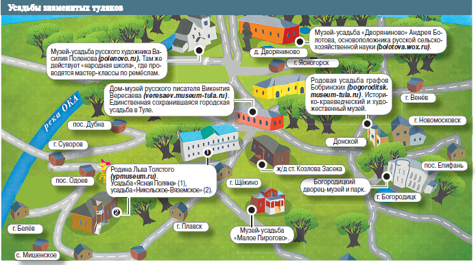 Но больше всего в Туле ждут туристов из Москвы. «Многие привыкли приезжать к нам на пару выходных дней, - уверен В. Груздев. - Но уже сейчас этого времени явно не хватит. Во-первых, изменилась сама Тула. Чего стоит недавно открытый музей мирового уровня - тульский Музей оружия: здесь можно на одном дыхании провести целый день. Кроме того, мы завершаем масштабную реставрацию Тульского кремля. У нас есть музеи пряника и самовара. Напомню, что в Кимовском районе области находится село Себино - родина святой блаженной старицы Матроны Московской. Здесь сохранился храм, в котором крестили святую. На средства благотворителей в 2014-м открыт музей, а в 2015-м установлена скульптура Матроны. Любите экзотику - приезжайте в экзотариум с крупнейшей в мире коллекцией змей. У нас ежегодно открываются новые и оригинальные частные музеи. Словом, если отдыхать не спеша, здесь и недели будет мало. Не говоря о жемчужинах области - «Ясной Поляне», Музее-заповеднике Василия Поленова и Куликовом поле. Его я называю местом силы, потому что вы обязательно получите здесь огромный заряд энергии».