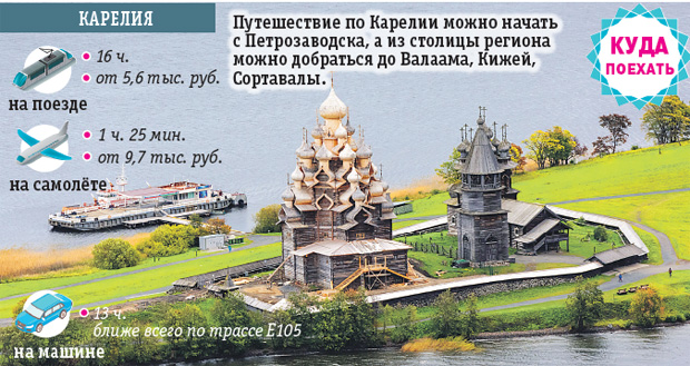Остров Кижи. Сверкающие под северным солнцем Преображенская и Покровская церкви – символ Кижей и всей русской деревянной архитектуры. Посмотреть на эти памятники, входящие в список Всемирного наследия ЮНЕСКО, в Карелию едут туристы со всего мира.