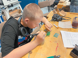 Сын Элины Маломуд Дмитрий паяет микросхему для дрона.
