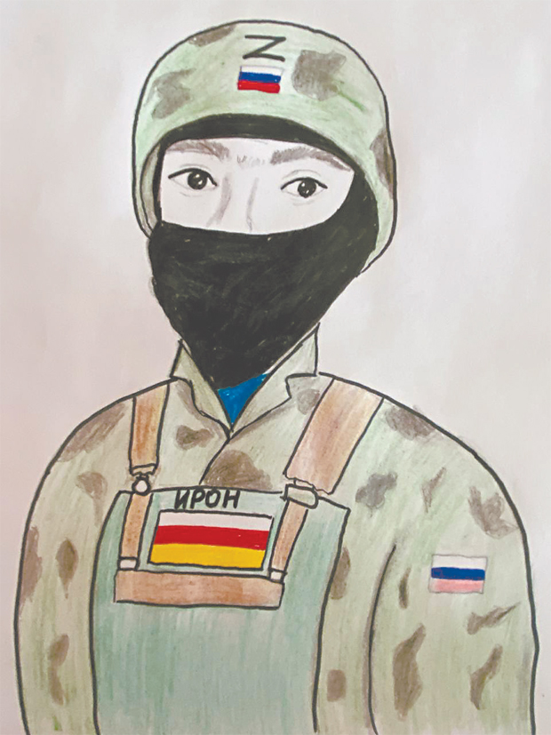 Позывной «Ирон» выбрал папа-осетин. Просился сам на передовую, так как очень хотел защищать Родину. Служит в Федеральной службе войск Росгвардии. Его хобби — проводить время с детьми. Рисовала дочь Мадина.