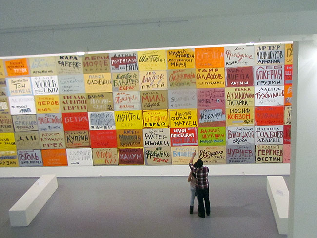 Всех, пришедших в московский Мультимедиа Арт музей на Остоженке встречает необычное зрелище — 80 разноцветных картинок, занимающих целую стену. На каждой картинке — имя человека, сыгравшего значительную роль в истории или культуре России — князей, художников, композиторов, поэтов. Мы можем узнать, что Андрей Боголюбский был половцем по матери, кумир миллионов Виктор Цой — корейцем, Святослав Рихтер — немцем, Дмитрий Шостакович — поляком, бабушкой Александра Невского была осетинка, отцом основателя космонавтики Константина Циолковского поляк, а матерью — татарка. И, естественно, не был забыт знаменитый арап Петра Великого, ставший прадедом Пушкина.Есть и нашит современники: выдающийся врач-кардиолог Лео Бокерия, балерина Майя Плисецкая, летчик —испытатель Магомед Толбоев и многие другие.