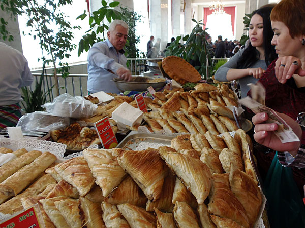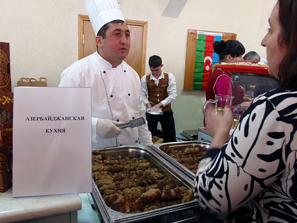 Особое оживление царило в буфете, где была развернута дегустация блюд национальных кухонь. Вот раздолье для гурманов! На нескольких десятках квадратных метров можно было познакомиться с любимыми блюдами жителей Узбекистана, Таджикистана, Татарстана, Азербайджана, Дагестана, Кыргызстана, Казахстана и даже Афганистана. Свои кулинарные способности демонстрировали повара посольских кухонь и аутентичных столичных ресторанов.