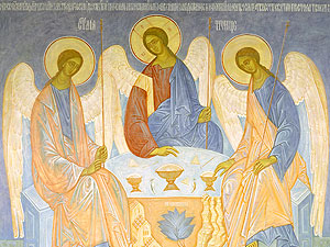 На иконе изображены три ангела, явившиеся Аврааму и предсказавшие ему рождение сына. Этот ветхозаветный эпизод символически раскрывает образ Святой Троицы. Единство трёх ипостасей является прообразом всякого единения и любви — «Да будут все едино, как Ты, Отче, во Мне, и Я в Тебе, так и они да будут в Нас едино» (Ин. 17:21). Левый ангел, означающий Бога-Отца, правой рукой благословляет чашу. Средний ангел (Сын), изображённый в евангельских одеждах Иисуса Христа, выражает готовность принести себя в жертву во имя любви к людям. Жест правого ангела (Святого Духа) завершает символическое собеседование Отца и Сына, утверждая высокий смысл любви.