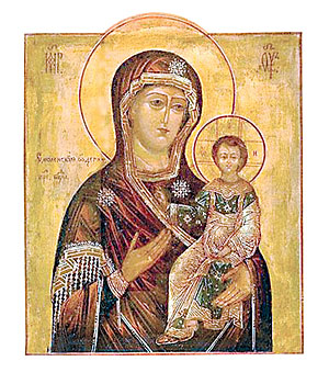 Смоленская икона Божией Матери, именуемая Одигитрией, имеет очень древнее происхождение. Она была принесена в Россию из Греции. Предположительно греческий император Константин Порфирородный благословил этой иконой дочь свою, царевну Анну, выдавая её замуж в 1046 году за черниговского князя Всеволода Ярославича. Затем она досталась в наследство сыну этой четы Владимиру Всеволодовичу Мономаху. Он-то и перенёс образ Одигитрии - благословение своей матери - из Чернигова в Смоленск, где княжил с 1097 года, и поставил её в соборном храме Успения Богоматери, заложенном им же 3 мая 1101 года. С этого времени икона Одигитрии и стала называться Смоленскою.
