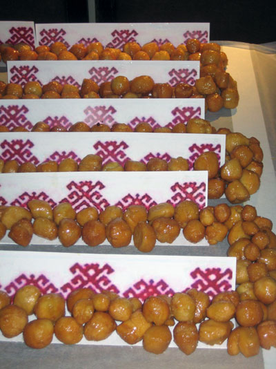 Уяча — это крохотные колобки, обжаренные в масле и сваренные в меду. Золотая горка уячи в медовой глазури традиционно украшает праздничный марийский стол и радует нежным и сладким вкусом. Рекордные 145 кг лакомства в течение двух ночей пекли 12 кулинаров Землячества Марий Эл в Москве. Им помогали их мужья и дети, так что сладость получилась семейной.