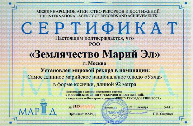 Выкладывали уячу в шесть рядов, чтобы получилась непрерывная 92-метровая косичка — в честь 92-летия Республики Марий Эл и еще как символ древнего марийского традиционного танца «Веревочка» («Кандыра»), также претендующего на звание самого длинного танца в мире. После тщательного замера президент Международного агентства рекордов и достижений Галина Свирщук объявила: «Новый мировой рекорд установлен!» и подписала специальный сертификат о достижении.