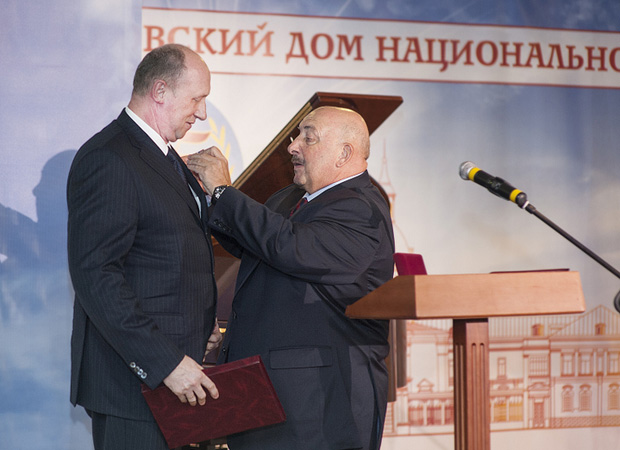 Председатель Комитета Государственной Думы Федерального Собрания Российской Федерации по делам национальностей Г.К. Сафаралиев награждает директора МДН Н.П. Комарова нагрудным знаком и почётной грамотой за активную общественно-политическую деятельность за подписью председателя Государственной думы Федерального собрания Российской Федерации С.Е. Нарышкина. Фото: автор