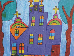...Я стою одна посреди зала, с четырёх сторон окружённая, зажатая в тиски, чужим детским миром, длившимся всего 7 лет. На часах уже 17.00, конец рабочего дня, но здесь в первый день выставки пока никого, даже папа Валера опаздывает, и я проваливаюсь в Ромкиных снеговиков, пальмы, рыб-клоунов, Незнайку и лодки в океане. Фломастер и карандаш. От четырёх до семи. Папа не помнит, какая работа была последней... Может, вот эта: красное столичное небо или зимний пейзаж, солнце над ёлками - из окна первого московского хосписа...