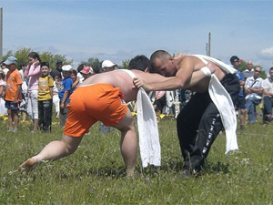 Вышитое полотенце и заколотый баран как символы силы и мужества - таков традиционный подарок батыру (герою), победителю в соревнованиях по национальной борьбе «кореш». Согласно правилам каждый спортсмен обхватывает своим полотенцем противника за талию и борется. Жюри оценивает только активные действия, и, если боец упадёт на ковёр случайно, победы его противнику не засчитают. Традиционно встречу начинают два мальчика 5-6 лет, затем поочерёдно соревнуются мальчики постарше и мужчины среднего возраста. И если ранее в состязании участвовали только мужчины, то сегодня на ковре нередко можно увидеть и женщин. Когда-то девушки только присутствовали на празднике. В ХХ в. специально для них стали проводить шуточные соревнования: бег с ложкой во рту с положенным на неё яйцом, бег с вёдрами на коромысле, наполненными водой. И вот они уже на ковре!