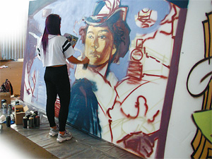 Когда всё было готово (холсты установлены, баллончики с краской и респираторы доставлены), художники начали... нет, не рисовать. Все как один принялись исполнять своеобразный ритуал - взбалтывать баллончики, так что треск шариков, перемешивающих краску, разносился по всей округе. Затем кто-то сразу приступил к распылению краски, другие долго подготавливались, изучая в руках эскизы.