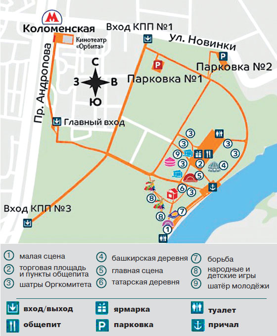 На нескольких сценических площадках пройдут концертные программы с участием профессиональных и самодеятельных художественных коллективов и вокалистов из Татарстана, Башкортостана, национальных общин Москвы и регионов России. На этнографической выставке под открытым небом гости смогут прогуляться по татарской и башкирской деревням, познакомиться с бытом двух братских народов и попробовать национальные блюда. Свои традиции и обычаи также представят крымские татары, ногайцы и другие народы.