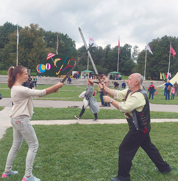 Признаться честно, поднять меч у меня получилось с трудом, хотя приноровиться, конечно, можно. Оказалось, мужчину зовут Григорий Якутовский, он писатель, историк, этнограф. Мой собеседник рассказал, что его площадка была одной из самых популярных на фестивале, многие, как и я, пытались научиться правильно держать боевой двуручный меч. Весит он 3,5 кг и был на вооружении у белорусов, сражавшихся с крестоносцами. А вот пораниться таким мечом у нас не получилось бы, ведь это лишь имитация оружия.