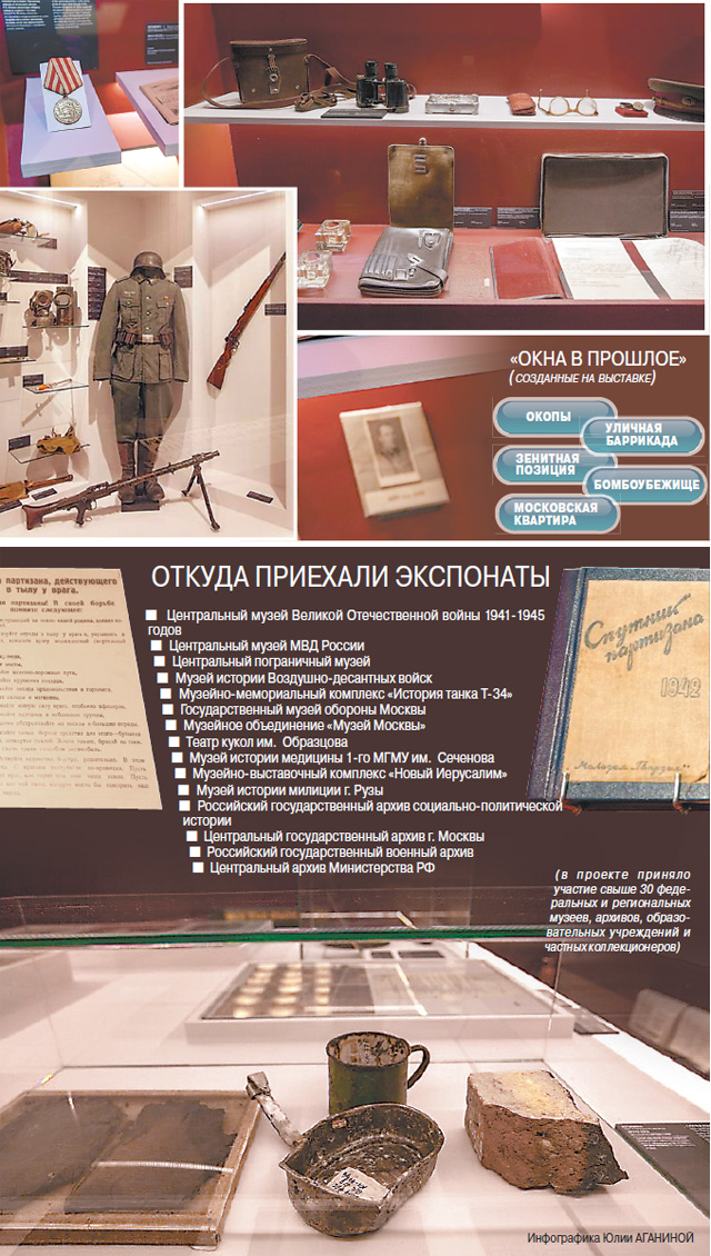 На площади около трёх тысяч квадратных метров (!) представлено свыше 1500 экспонатов. Среди них - образцы вооружения и боеприпасов, снаряжение и униформа, предметы быта и театральные афиши. Особый интерес представляют личные вещи защитников Москвы (в том числе Георгия Жукова, Семёна Будённого, Андрея Ерёменко, Фёдора Токарева, Зои Космодемьянской). Все эти экспонаты стали основой инсталляций, каждая из которых посвящена отдельной теме (см. инфографику).