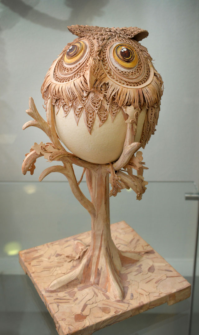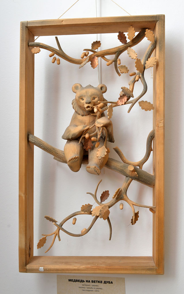 Перед нами птицы, каждое перо которых словно наполнено воздухом, пушистые звери, которых хочется погладить, ювелирной тонкости шкатулки, изящные игрушки... И над всем этим берестяным миром - огромная Жар-птица с роскошным двухметровым хвостом, воздушным и невероятным. Вся экспозиция, собственно, так и называется - «Под крылом Жар-птицы».