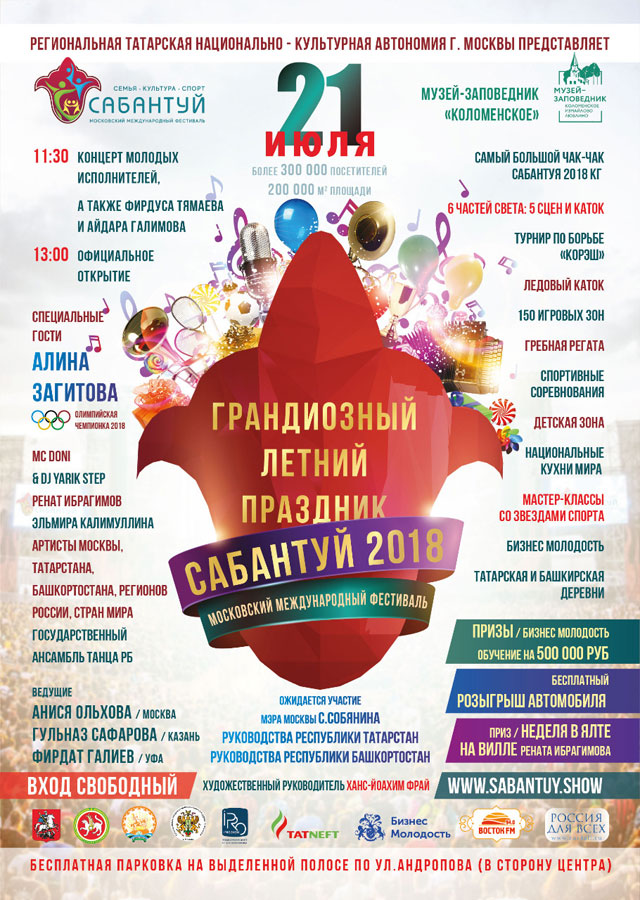 Тогда готовьтесь провести ближайшую субботу, 21 июля, в музее-заповеднике «Коломенское». Именно там пройдёт традиционный общегородской праздник Сабантуй, самый массовый из праздников плуга. В прошлом году на нём побывали 200 тысяч гостей. Шесть сцен, народные конкурсы (бой мешками на бревне, перетягивание каната, разбивание горшков с закрытыми глазами), ярмарка национальных сувениров и блюд - как всегда, программа Сабантуя будет насыщенной и интересной.