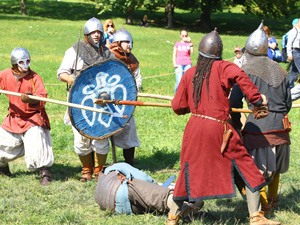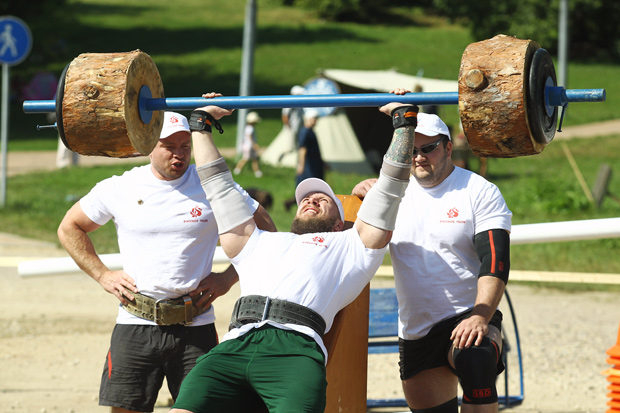 Подкрепившись и изрядно увеличив вес, гости переходили на площадку славянских силовых развлечений «Богатырская застава». И всё же оставались легче одного из легчайших участников - победителя соревнований «Самый сильный человек Южного Урала» Михаила Сибагатова, весящего около 100 кг. Гантель из берёзы, которую он поднимал над головой, весила 50 кг!