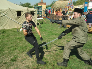 Истории на фестивале было отведено особое место. Организаторы подготовили экспозицию, включавшую показ документальных и художественных фильмов, а также описания подвигов казаков в Отечественной войне 1812 г. и Великой Отечественной войне. На площадке «Казачье подворье» теснились уютные курени. Каждый гость непременно заглядывал через плетень: взгляд притягивал сияющий на солнце бок рукомойника, гремела цепь колодца. «Хозяева» приглашали зайти внутрь дома, отведать блюда казачьей кухни, погулять по двору. «Это ручная мельница, вот сепаратор, который отделял сливки, - показывали старинные вещи в курене Вологодского казачьего отдела. - Попробуйте, какая ступа тяжеленная. А здесь у нас казачье седло, сигнальная пушка и рогатина - с ней когда-то ходили на медведя».
