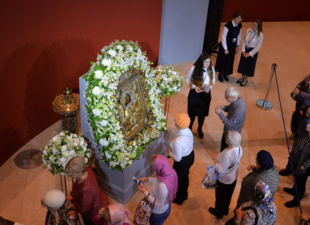 Первым встречает гостей зал иконы. Многим пришедшим на выставку не сразу удавалось отнестись к представленным изображениям святых как к предметам искусства, ведь они связывают человека с Богом, а значит, привычно сперва прошептать молитву и перекреститься. К одной из икон, дошедшей до нас из глубины веков, на выставке всегда очередь для поклонения. Возраст экспоната – самый почтенный. По преданию, Псково-Печерская икона Божией Матери «Умиление» (а именно о ней идёт речь) была написана в 1521 г. иеромонахом Арсением с иконы Божией Матери «Владимирская». В Псково-Печерский монастырь икону принесли купцы Василий и Феодор в 1529–1570 гг. С тех пор не один раз она являла свою милость. В память чудесного избавления Пскова при царе Феодоре Иоанновиче святой образ украсили жемчугом, алмазами, изумрудами, яхонтами и аметистами. Во время войны 1812 г. в день, когда был совершён крестный ход с иконами Божией Матери «Умиление» и «Успение», русские войска отбили Полоцк, и Псков оказался вне опасности.