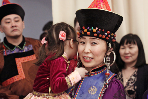 Как заметили организаторы, с каждым годом на Сагаалгане всё чаще встретишь гостей, нарядившихся в национальные одежды. Для них даже провели конкурс национального костюма — с жюри и призами. В ожидании награждения мы поговорили с супругами Баиром и Тамирой, облачёнными в расшитые одеяния и головные уборы. Они перебрались в Москву, костюмы привезли с собой, а маленьким дочерям Алтане и Аяне сшили их здесь. «Хотим показать девочкам, кто мы такие, — сказали родители. — В семье мы общаемся на родном языке, слушаем бурятскую музыку».