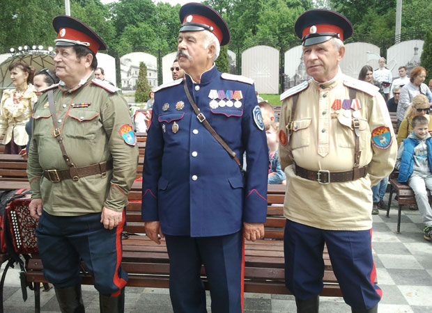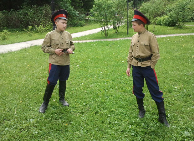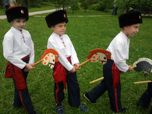 Со сцены на поляну парка промчались казачата верхом на деревянных лошадках. По совету их наставницы приглядываемся к артистическому реквизиту. На детских шашках — не пластиковых, а металлических — видны щербинки от «сражений». Эти ребята мечтают вырасти и взять в руки шашку тяжёлую и острую.
