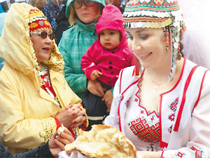 Действительно, организаторы постарались: на день территория у Измайловского кремля превратилась в старинную чувашскую деревню. На площадке, вокруг которой столпились зрители с зонтами и в дождевиках, разыгрывалось красочное действо. Под протяжные напевы в центр выплыли женщины в национальных чувашских одеждах. Одни разбрасывали из туесов зёрна, изображая весеннюю посевную, другие несли большой деревянный плуг. Каждый желающий мог повязать на него яркую ленту и пожелать себе и своим близким благополучия и здоровья. Не обошлось и без каравая, от которого по традиции каждый пришедший на праздник гость должен был отщипнуть кусочек.