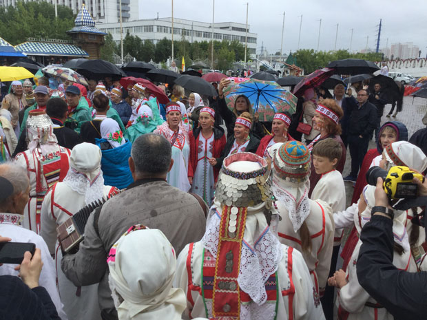 Народные песни были слышны уже на подходе к кремлю. Серую картинку повседневности разбавляли мелькающие то тут, то там белоснежные пятна национальных чувашских костюмов, расшитых красным орнаментом, ярких флагов и баннеров, жёлтых дождевиков и клякс разноцветных зонтов.