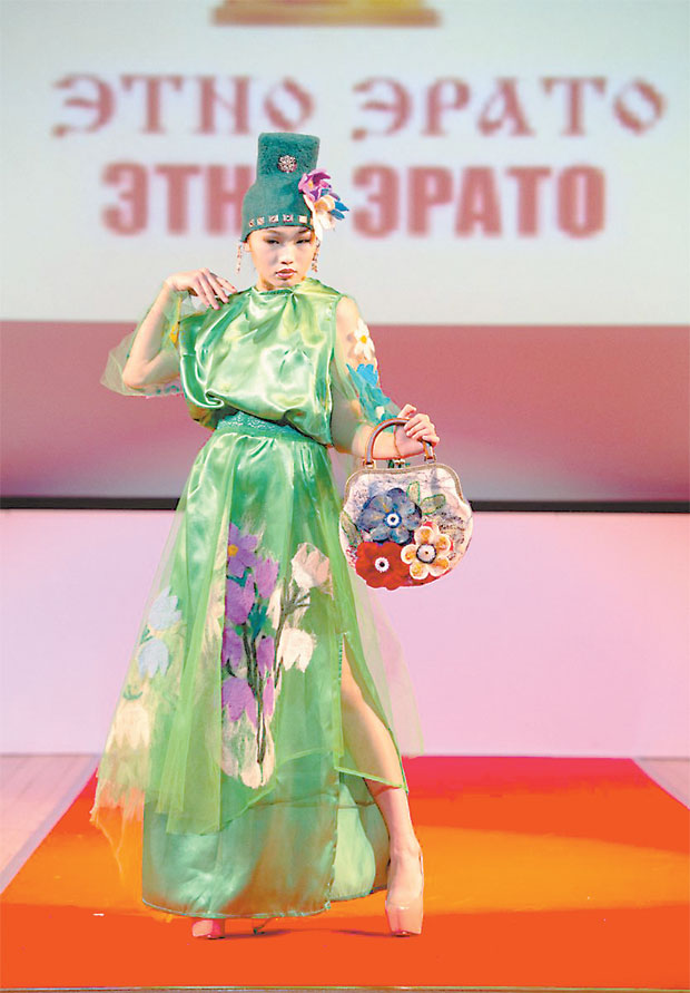 Шесть девушек в пышных юбках из фатина, валяных топах, расшитых цветами, и замысловатых шляпках проплывают по залу. Это коллекция Майкоты Ноговицыной «Цветы земли Якутской».