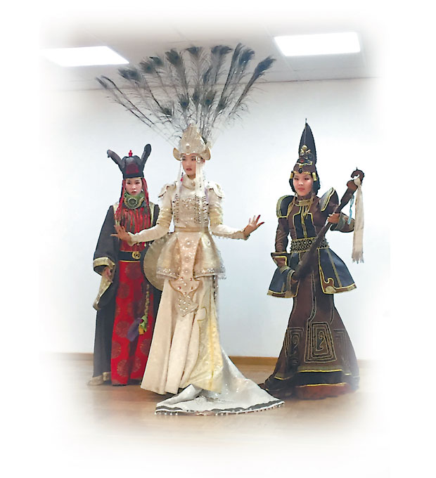 На сцене – девушки-модели из Республики Тыва, словно фарфоровые статуэтки замерли перед публикой, позволяя внимательно рассмотреть их необычные одежды: яркие костюмы из национального шёлка, обильно украшенные камнями, жемчужные ожерелья, короны с павлиньими перьями. Неожиданно «статуэтки» оживают, в руках одной из них появляется бубен, звучит мистическая музыка.