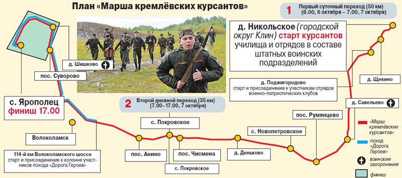 В рамках «Марша кремлёвских курсантов» 7 ноября организуют военно-патриотический поход «Дорога героев». Его участники преодолевают дистанцию протяжённостью 25 км. Маршрут проходит от 114-го км Волоколамского шоссе до Яропольца.