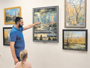 Посетители вернисажа рассматривают картину художницы Инны Егоровой, на которой изображены башни «Москва-Сити».