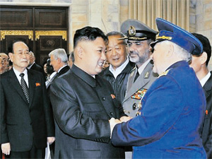 Встреча руководителя КНДР Ким Чен Ына с ветераном Корейской войны полковником Яном Кановым по случаю 60-летия Победы.