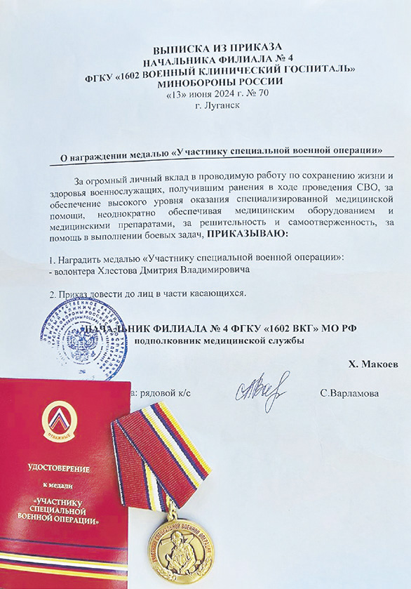 «Мы привезли большую машину гуманитарной помощи как для жителей, так и для бойцов. Нашим защитникам передали квадрокоптер, маскировочные сети и другие важные вещи, – пояснил он. – Ребятам понадобилась машина для передвижения на линии фронта. Всем нашим округом мы открыли целевой сбор, но завершить его не успели. Так как один очень хороший человек, коммерсант, приобрёл автомобиль и передал нам. Эту машину мы нагрузили генераторами, тепловизорами, бронежилетами и передали бригаде. Ребята были очень рады!» На днях руководителя Центра досуга «Личность» Дмитрия Хлестова нашла очень важная, значимая награда. Его наградили медалью «Участнику специальной военной операции».